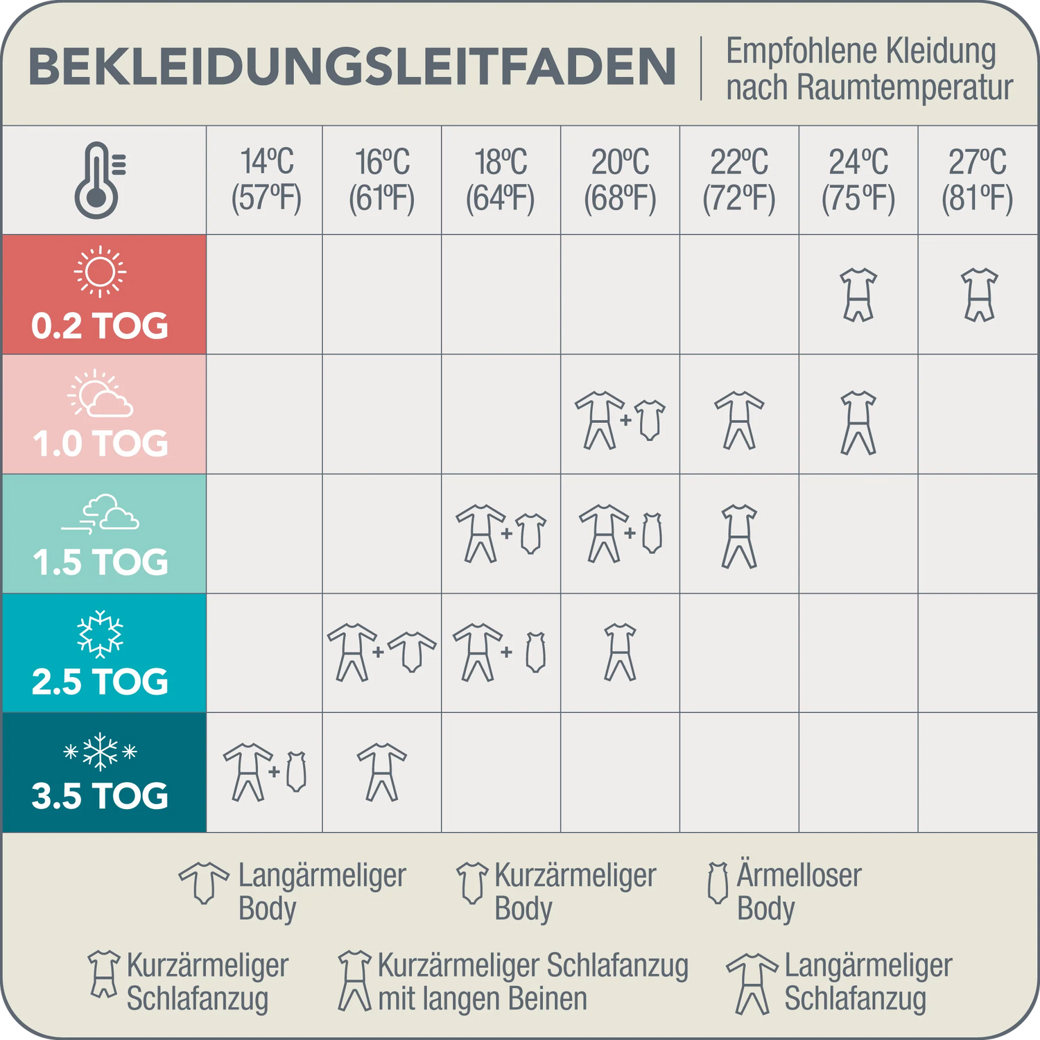 Unter jeder gewählten Schlafbekleidung empfehle ich eine atmungsaktive Basisschicht. Außerdem sollte Schlafbekleidung gewählt werden, die einen zum Raumklima passenden TOG-Wert hat. So kann sichergestellt werden, dass Ihr Baby die ganze Nacht über angenehm temperiert bleibt, da sowohl Überhitzung als auch Frieren den Schlaf stören können.